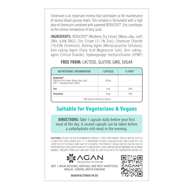 Συμπλήρωμα διατροφής με πατενταρισμένο εκχύλισμα φύλλων λευκής μουριάς, ψευδάργυρο και χρώμιο.